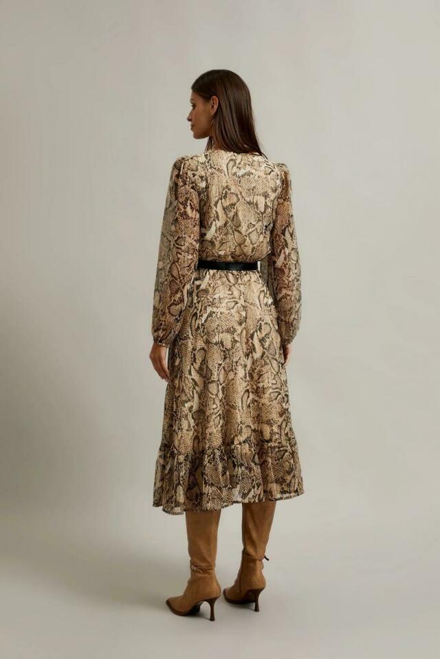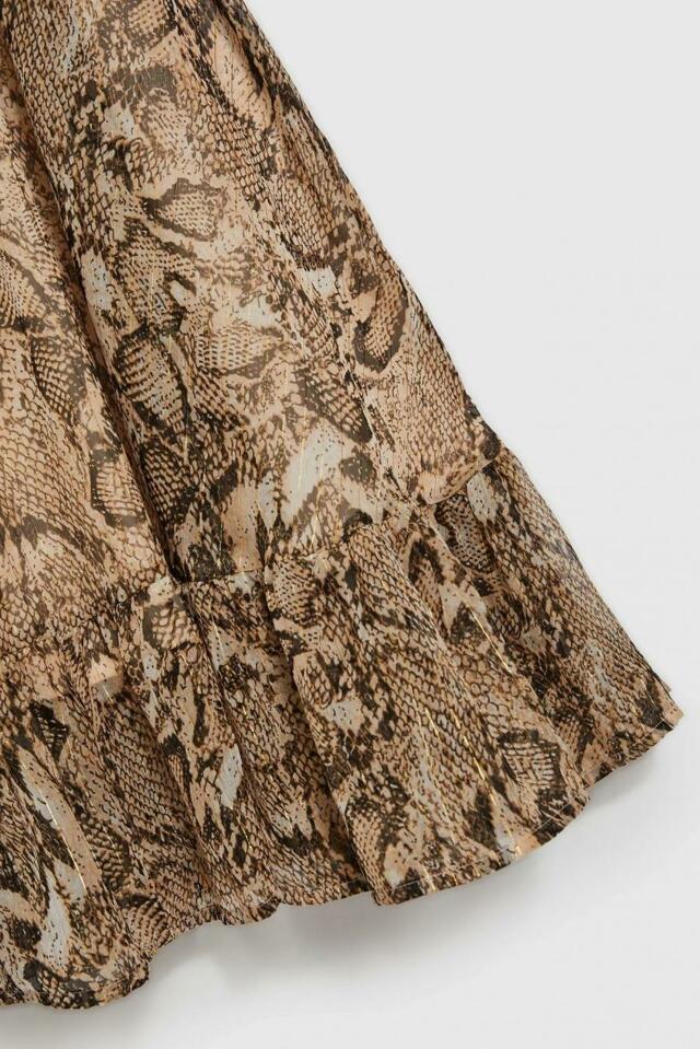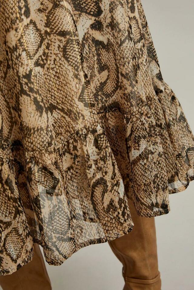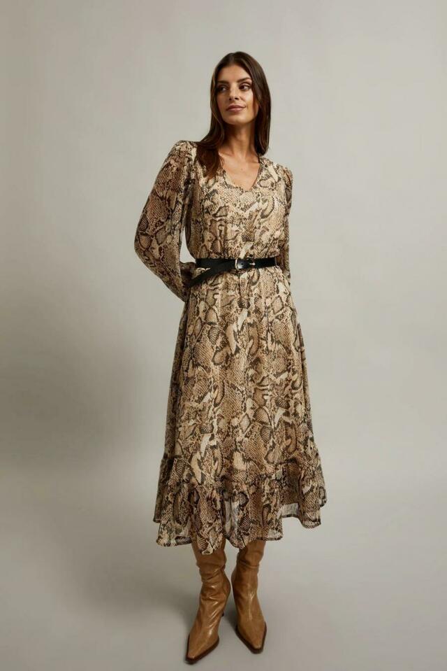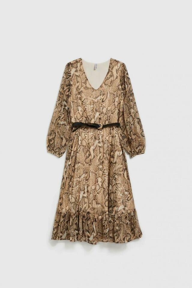 Béžové šaty zdobené zvířecím potiskem. Je vyrobena z polyesteru, má obláčky, podšívku, volány a Zobrazit více