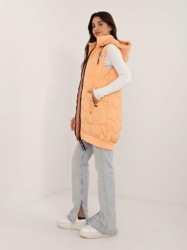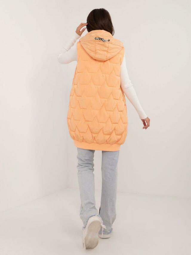 Dámská prošívaná dlouhá vesta s odnímatelnou kapucí ve světleoranžové barvě;